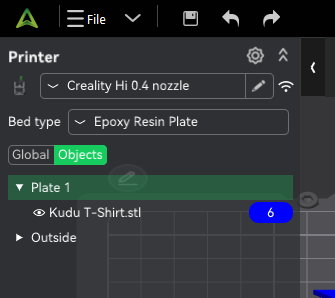 Before slicing the plate, make sure that the plate is set to the material that you want. In the image below the material is the blue button with the “6”.