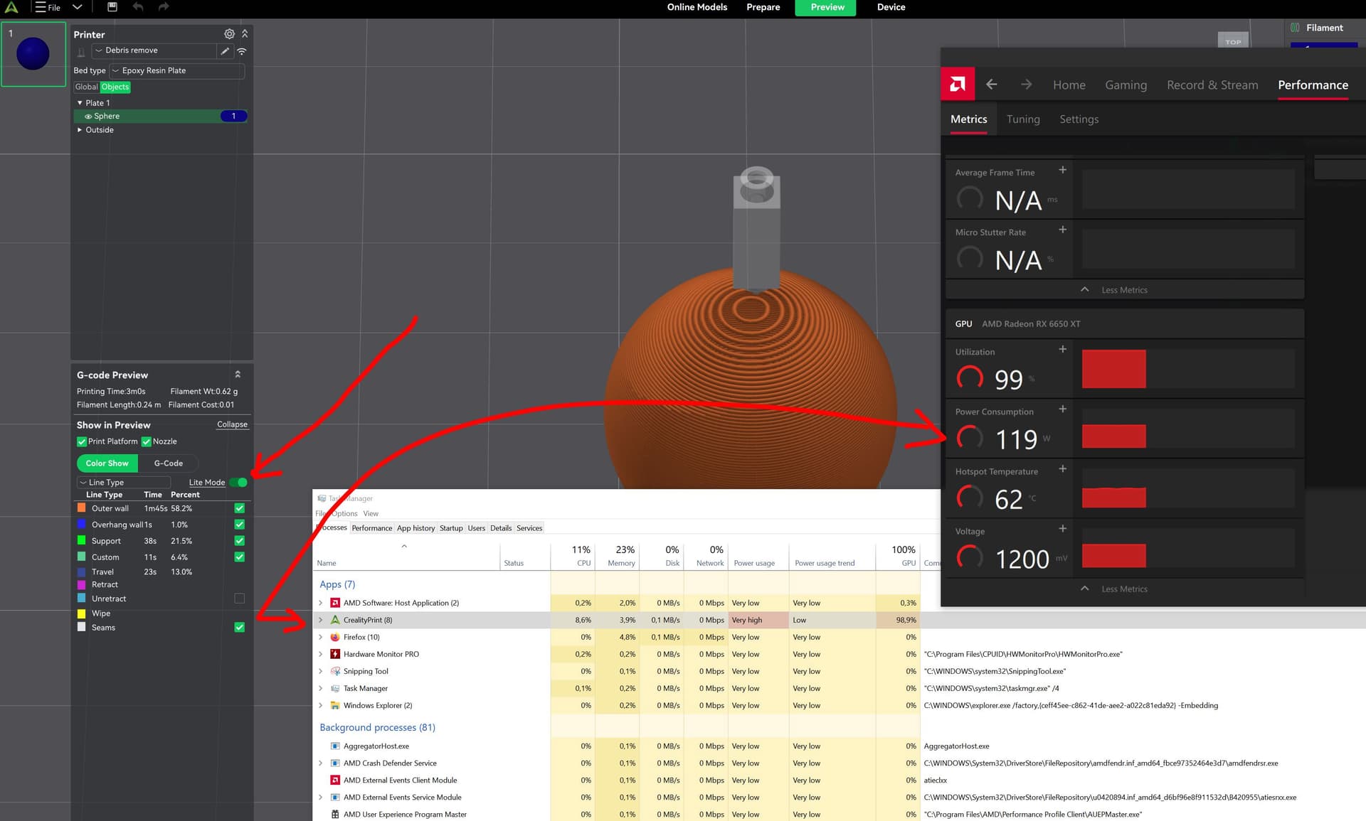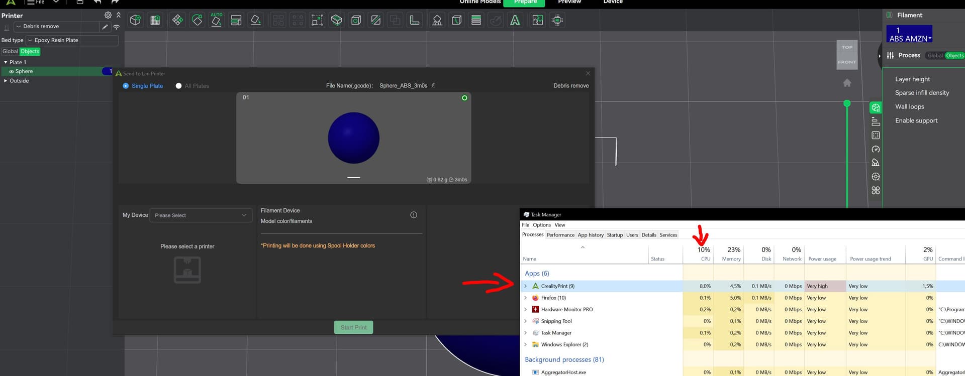Then when i want to print - and that window pops up before printing, it uses some 15% of the CPU, i7 13700k, and 15% is a lot. The thing is, the preview window uses 100% of the GPU for infinite time, and that popup window uses 15% of the CPU for infinite time.